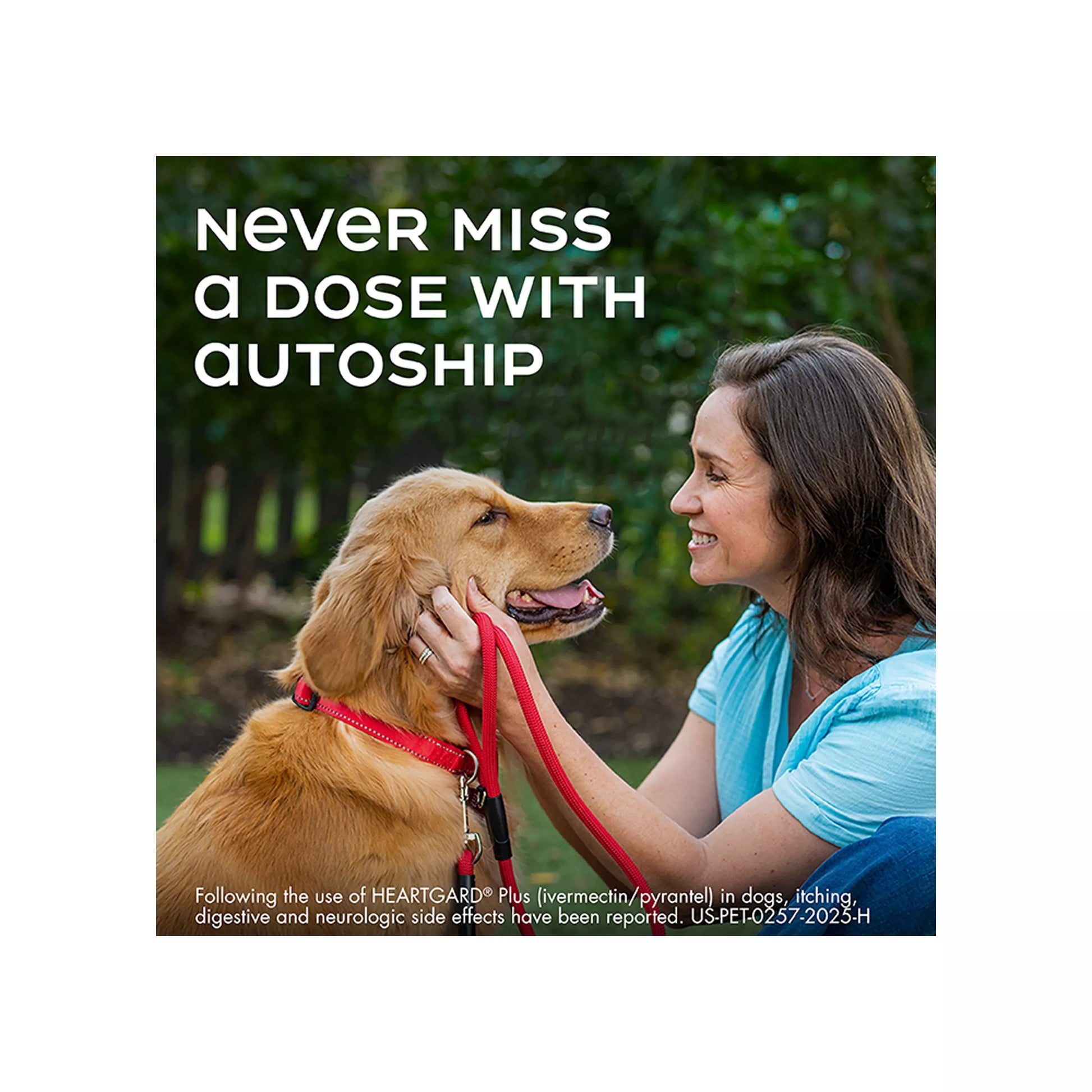 HEARTGARD Plus (ivermectinpyrantel) Chewables for Dogs are the #1 vetrecommended1protection against heartworm disease - an invisible threat that can be caused by just one bite from an infected mosquito and can lead to permanent damage in less than three months.2HEARTGARD Plus chews also treat and control 3 species of hookworms and 2 species of roundworms in dogs, which are among the most prevalent intestinal nematode parasites.3With cases in all 50 states, it's important to protect your dog with a monthly heartworm preventive yearround.3Following the use of HEARTGARD Plus chews, digestive and neurologic side effects have been reported.