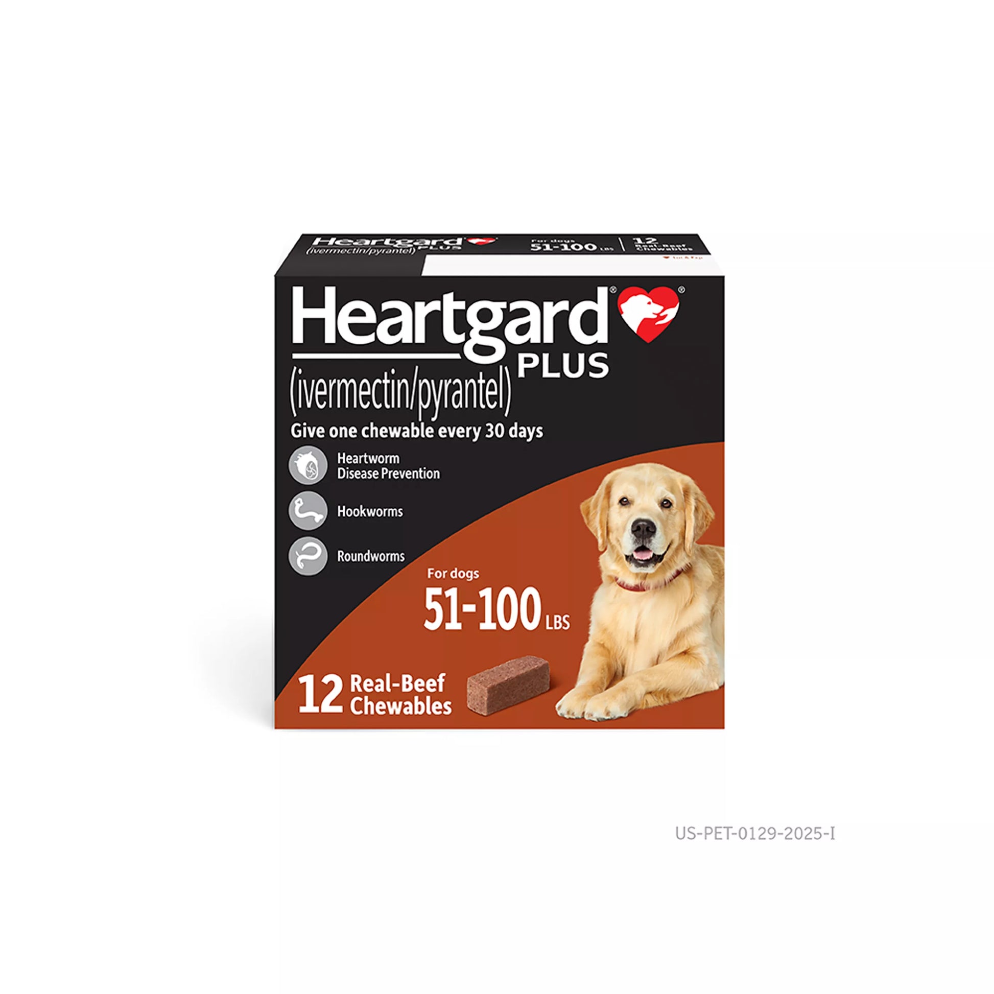 HEARTGARD Plus (ivermectinpyrantel) Chewables for Dogs are the #1 vetrecommended1protection against heartworm disease - an invisible threat that can be caused by just one bite from an infected mosquito and can lead to permanent damage in less than three months.2HEARTGARD Plus chews also treat and control 3 species of hookworms and 2 species of roundworms in dogs, which are among the most prevalent intestinal nematode parasites.3With cases in all 50 states, it's important to protect your dog with a monthly heartworm preventive yearround.3Following the use of HEARTGARD Plus chews, digestive and neurologic side effects have been reported.