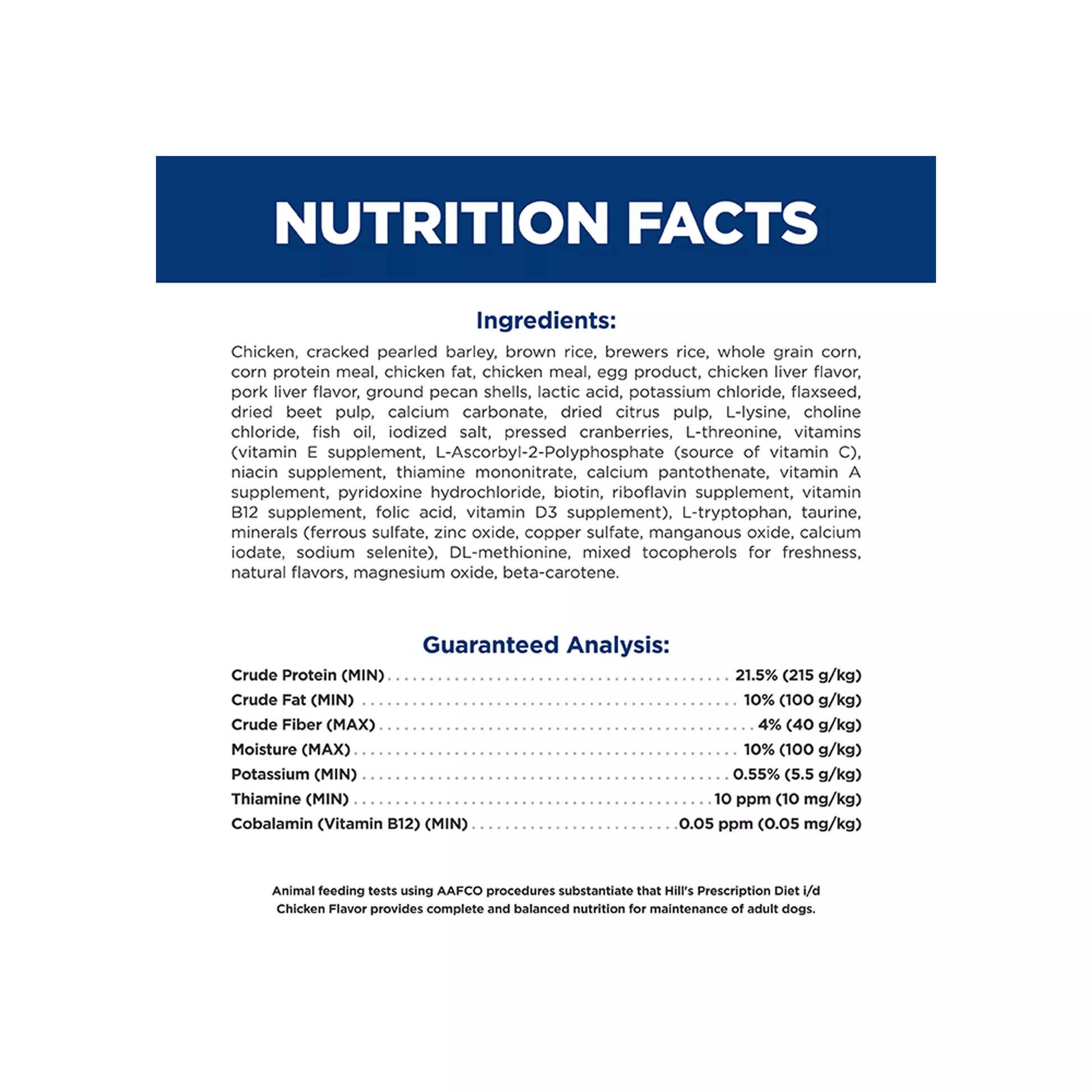 Nutritional Benefits Hill's Prescription Diet id Dry Adult Dog Food is greattasting nutrition, clinically proven to help manage digestive upsets. Its high digestibility supports nutrient absorption, while added electrolytes and B vitamins help replace nutrients lost due to digestive issues. Fortified with omega3 & 6 fatty acids to support skin and coat health. Contains clinically proven antioxidants to help support a healthy immune system. Made with Hill's breakthrough ActivBiome+ Digestion, a proprietary blend of prebiotic fibers, which is clinically shown to activate the gut microbiome to support digestive health and promote healthy stool. Hill's Prescription Diet id Dry Adult Dog Food is specially formulated to support digestive health and meets the unique nutritional needs of adult dogs. It's available in two kibble sizes, Regular and Small Bites!