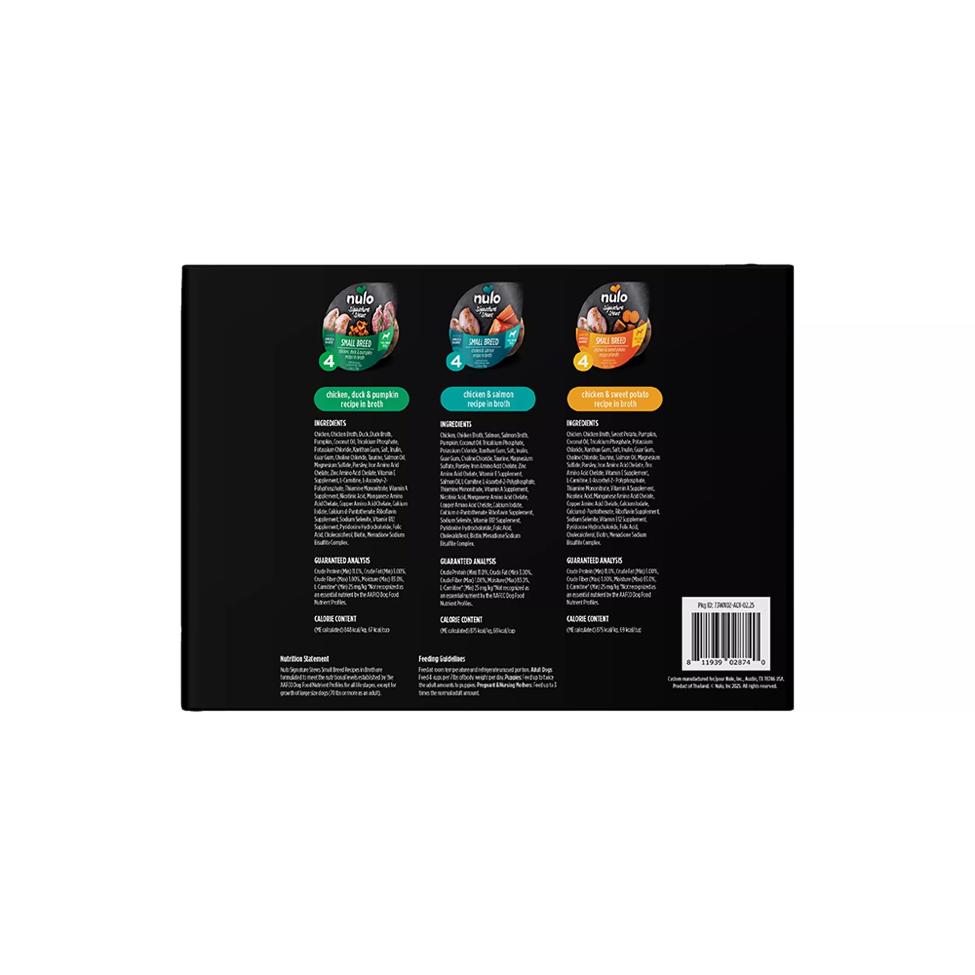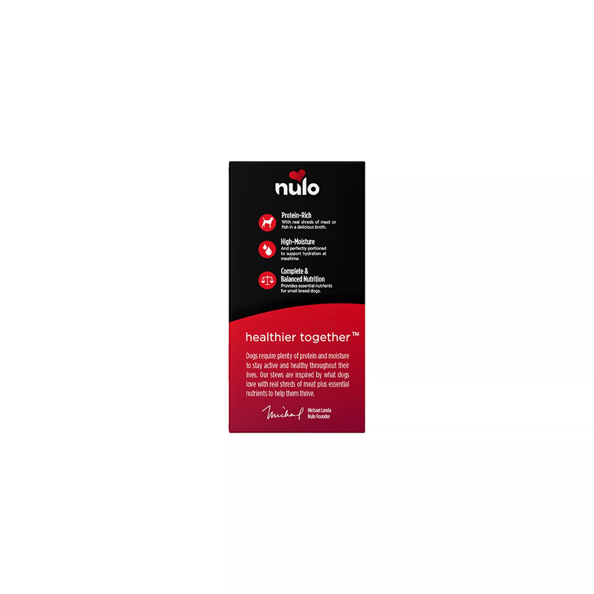 Nulo Signature Stews are grain-free, complete and balanced meals that add moisture, nutrition, and flavor to your dog's diet. This recipe is made with essential nutrients for small breed dogs, with ingredients real meat and wholesome vegetables, all in a collagen-rich broth. It's conveniently packaged so you can take wholesome nutrition wherever you and your pup go. Protein-rich, with real shredded meat and fish in a delicious broth. High-moisture and perfectly portioned to support hydration at mealtime. Provides essential nutrients for small breed dogs. Coconut oil and salmon oil provide critical Omega fatty acids that nourish skin and coat. Taurine added to support a healthy heart.