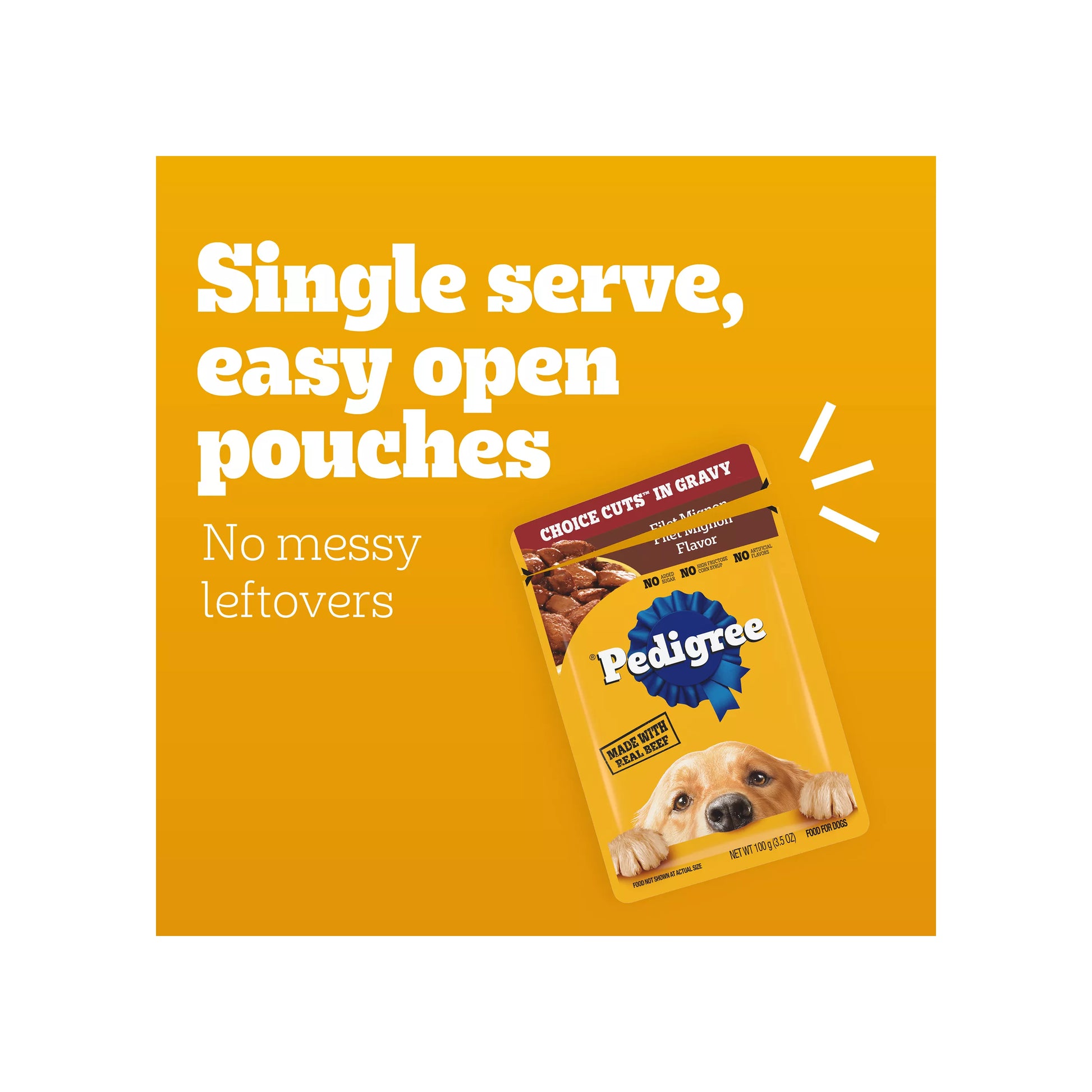 Dogs bring out the good in us. Pedigree brings out the good in them. Express your love for your dog by serving Pedigree Choice Cuts In Gravy Dog Food 48-Count Variety Pack. These great-tasting wet dog food recipes are 100% complete and balanced food for adult dogs and are made with real beef or real chicken, bringing a filling and familiar flavor to mealtime. Pedigree Choice Cuts In Gravy Dog Food 48-Count Variety Pack features four delicious options Chicken Casserole, Filet Mignon Flavor, Beef, Noodles & Vegetables Flavor, and Hickory Smoked Chicken Flavor, so your dog can have favorites to choose from. This versatile soft dog food can be served as a topper, mixed with dry dog food, or enjoyed by itself as a complete meal for adult dogs, bringing your dog a variety of ways to indulge. Crafted with no high fructose corn syrup, artificial flavors, or added sugars although, trace amounts may be present due to potential cross-contact at manufacturing, Pedigree Choice Cuts In Gravy Dog Food 48-Count Variety Pack shows your dog that you care and want them to have great tasting food.