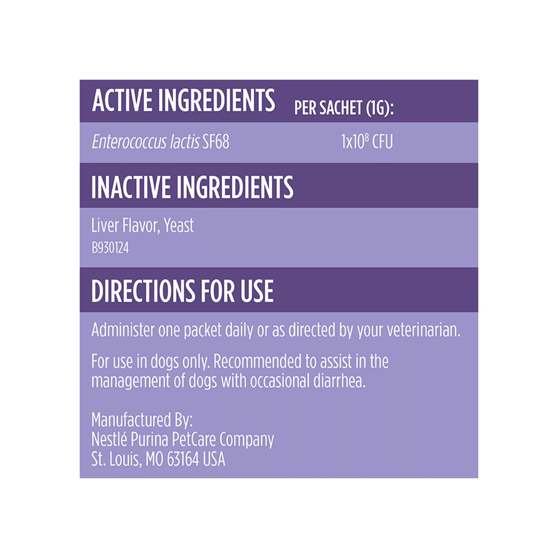 Ingredients Active Ingredients Per Sachet (1g) Enterococcus Faecium SF68 1x10^8 CFU. Inactive Ingredients Liver Flavor, Yeast. B930124