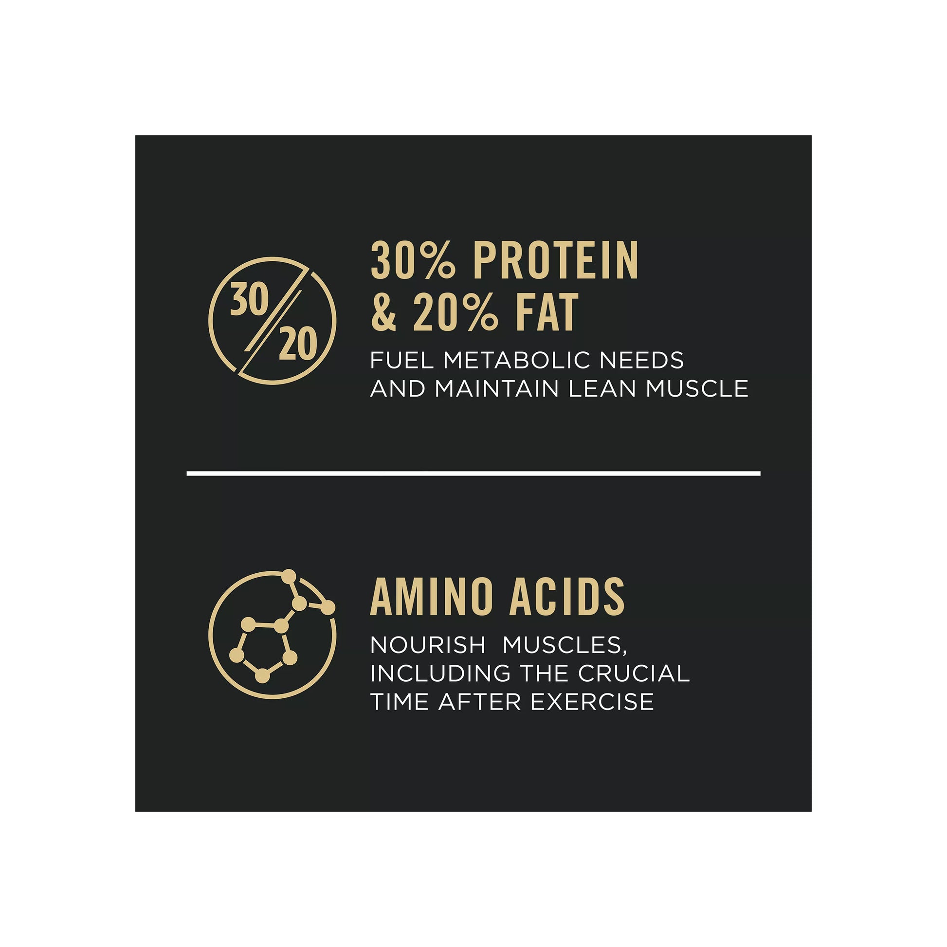 Features & Benefits High protein dry dog food formula, with real chicken as the first ingredient and concentrated nutrition to optimize oxygen metabolism (VO2 Max) for increased endurance. Amino acids nourish muscles, including the crucial time after you've given your dog exercise. 30 percent protein and 20 percent fat fuel metabolic needs and maintain lean muscle, while EPA, an omega3 fatty acid, and glucosamine for dogs help support joint health and mobility. This Purina Pro Plan dog food offers 100 percent complete and balanced nutrition for highly active dogs, including DHA, to help nourish brain and vision development. This chicken dog food recipe from a veterinarianrecommended brand is proudly manufactured in Purinaowned U.S. facilities and designed to nourish dogs in all stages of life. Spoil your pet with Purina products. Reward yourself with points on every purchase. Download the myPurina app today.
