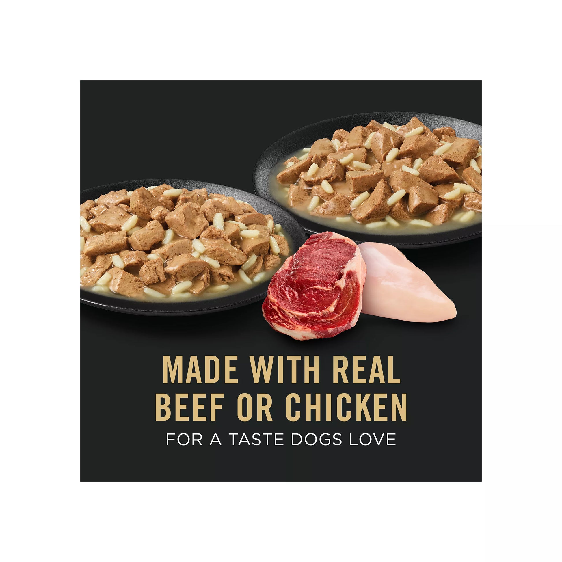 Features & Benefits Purina Pro Plan Specialized Large Breed Dog Food variety pack featuring real beef or chicken and a taste dogs love. Chicken and rice or beef and rice dog food for large breeds with gravy provides specialized 100 percent complete and balanced nutrition for adult dogs over 50 pounds. Premium dog food nutrition for dogs over 50 pounds, including essential vitamins and minerals, including calcium and phosphorus to maintain strong bones and teeth. Wet dog food for dogs helping to support a healthy immune system. High protein adult dog food to help maintain lean muscle. Spoil your pet with Purina products. Reward yourself with points on every purchase. Download the myPurina app today.
