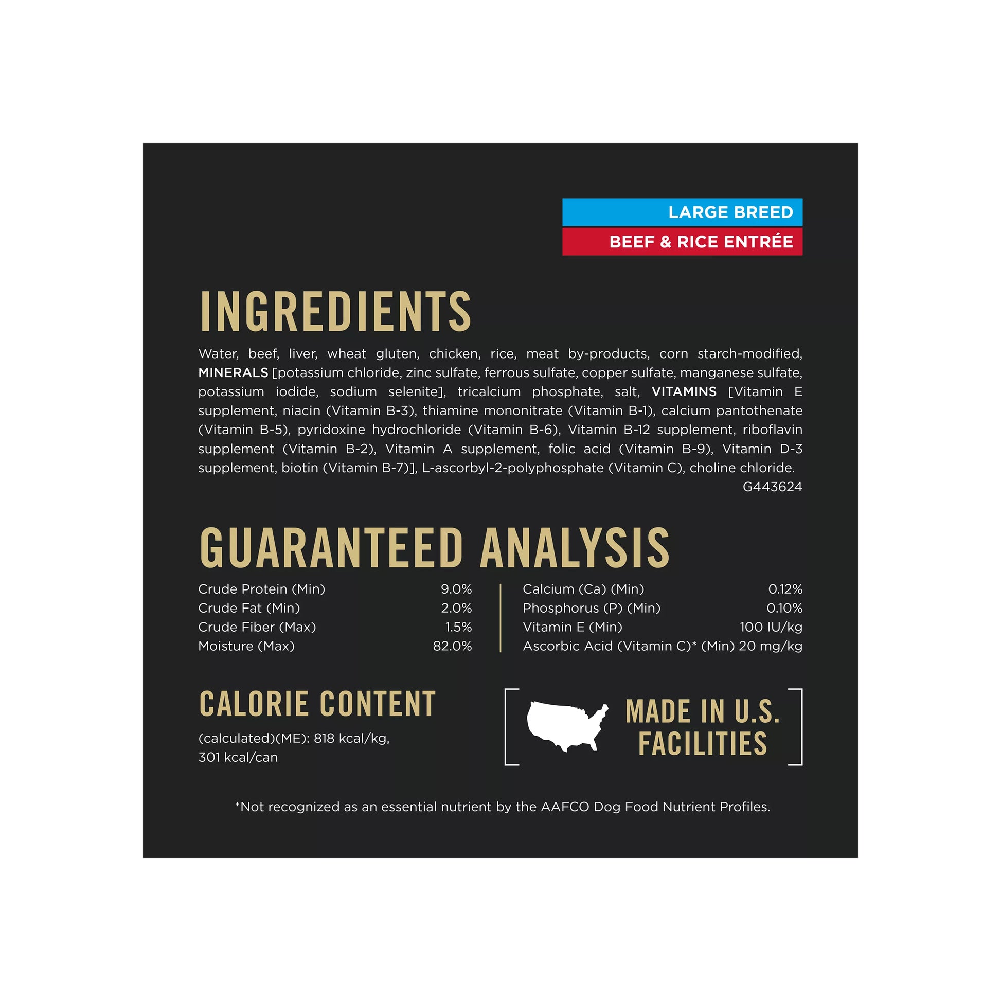 Ingredients Chicken & Rice Entre Water, Chicken, Liver, Wheat Gluten, Rice, Turkey, Meat ByProducts, Corn StarchModified, MINERALS [Potassium Chloride, Zinc Sulfate, Ferrous Sulfate, Copper Sulfate, Manganese Sulfate, Potassium Iodide, Sodium Selenite], Tricalcium Phosphate, Salt, VITAMINS [Vitamin E Supplement, Niacin (Vitamin B3), Thiamine Mononitrate (Vitamin B1), Calcium Pantothenate (Vitamin B5), Pyridoxine Hydrochloride (Vitamin B6), Vitamin B12 Supplement, Riboflavin Supplement (Vitamin B2), Vitamin A Supplement, Folic Acid (Vitamin B9), Vitamin D3 Supplement, Biotin (Vitamin B7)], LAscorbyl2Polyphosphate (Vitamin C), Choline Chloride. G443722; Beef & Rice Entre Water, Beef, Liver, Wheat Gluten, Chicken, Rice, Meat ByProducts, Corn StarchModified, MINERALS [Potassium Chloride, Zinc Sulfate, Ferrous Sulfate, Copper Sulfate, Manganese Sulfate, Potassium Iodide, Sodium Selenite], Tricalcium Phosphate, Salt, VITAMINS [Vitamin E Supplement, Niacin (Vitamin B3), Thiamine Mononitrate (Vitamin B1), Calcium Pantothenate (Vitamin B5), Pyridoxine Hydrochloride (Vitamin B6), Vitamin B12 Supplement, Riboflavin Supplement (Vitamin B2), Vitamin A Supplement, Folic Acid (Vitamin B9), Vitamin D3 Supplement, Biotin (Vitamin B7)], LAscorbyl2Polyphosphate (Vitamin C), Choline Chloride. F443622