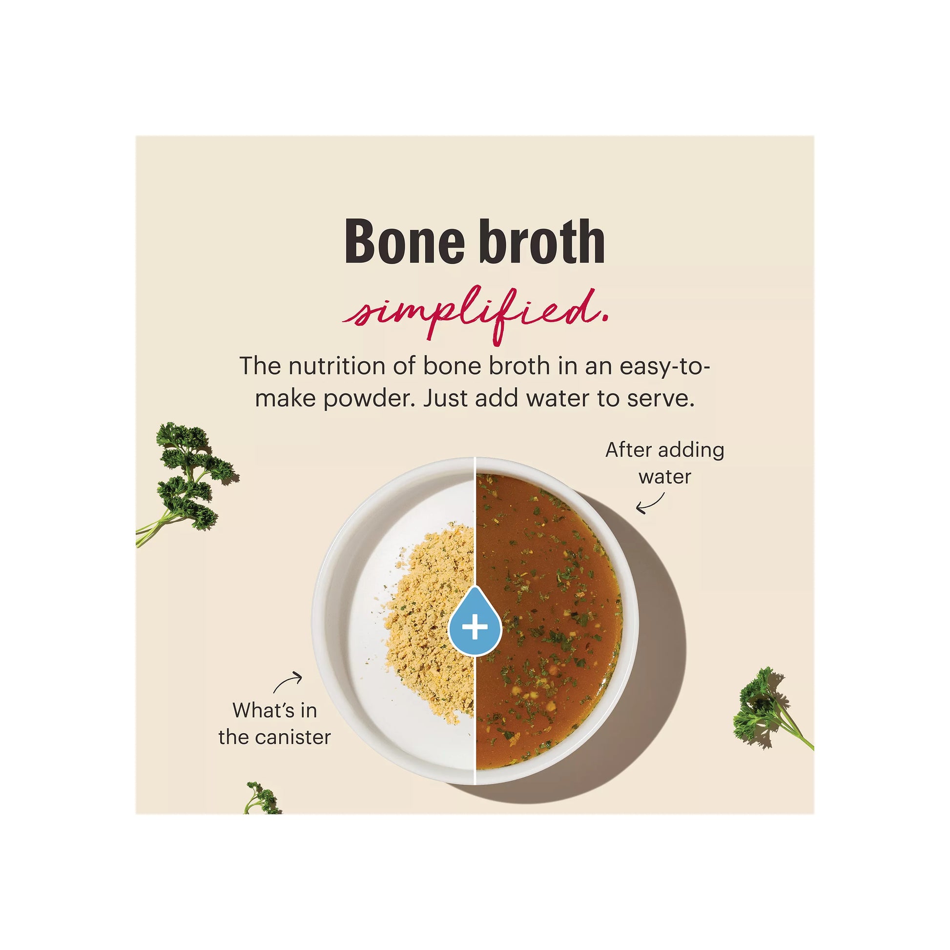 BONE BROTH SIMPLIFIED All the nutrition of bone broth for dogs in a compact powder that takes up limited shelf space and doesn't need refrigeration. Just add warm water when you're ready to serve.